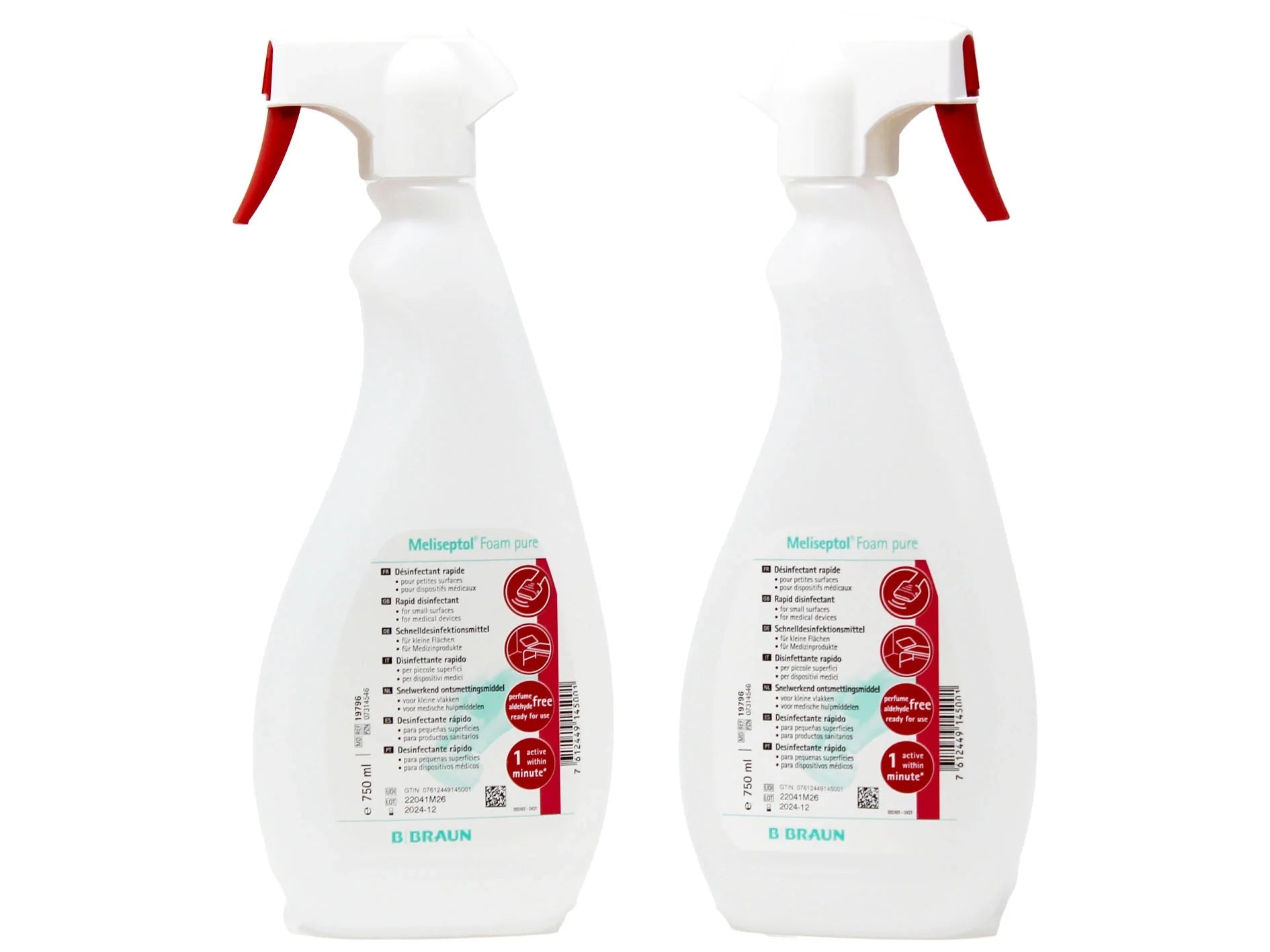 B|Braun Meliseptol® Foam pure – der parfümfreie Desinfektionsschaum für die schnelle und materialschonende Desinfektion kleiner und alkoholempfindlicher Flächen. Ideal geeignet für Kunststoffoberflächen, medizinische Geräte, Acrylglas, Ultraschallköpfe oder Untersuchungsliegen. Meliseptol® Foam pure bietet eine zuverlässige Wirkung gegen ein breites Spektrum an Erregern, ohne Aerosolbildung beim Sprühen.