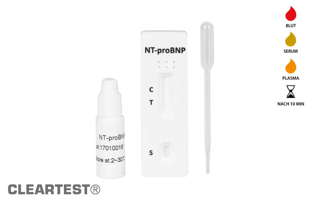 CLEARTEST® NT-pro BNP Herzinsuffizienzmarker Schnelltest – Eine essentielle Diagnosehilfe zur schnellen Bestimmung kardialer Peptidhormone, die im linken Ventrikel gebildet werden. Dieser Test spielt eine entscheidende Rolle in der Diagnose und Therapiekontrolle von Herzinsuffizienz.