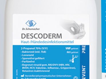 Descoderm ist ein parfümfreies, alkoholisches Desinfektionsmittel zur sicheren Haut- und Händedesinfektion. Es verzichtet auf kumulierende Langzeitwirkstoffe sowie potentiell allergisierende Zusatzstoffe und eignet sich besonders für haut- und allergieempfindliche Personen.