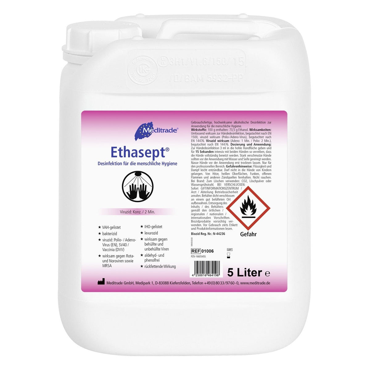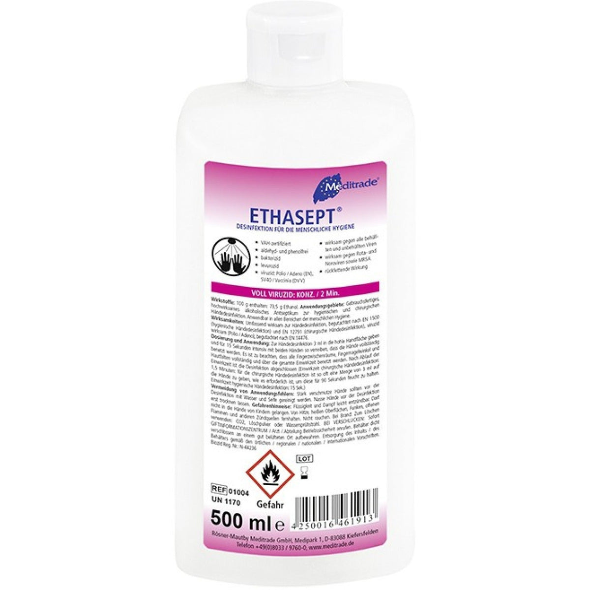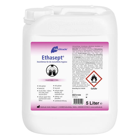 Ethasept® - Das Meditrade Ethasept® Händedesinfektionsmittel ist ein sehr schnell und umfassend wirksames, gebrauchsfertiges, alkoholisches Desinfektionsmittel ohne Parfüm- und Farbstoffe, welches zur Desinfektion für die menschliche Hygiene geeignet ist.