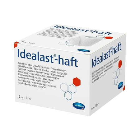 Idealast-haft Idealbinde 6 cm x 10 m ist eine kohäsive, dauerelastische Binde mit kurzem Zug und ca. 90 % Dehnbarkeit. Der beidseitige Hafteffekt sorgt für einen sicheren, rutschfesten Sitz. Durch den hohen Arbeitsdruck bei niedrigem Ruhedruck kann die Binde auch im Ruhezustand getragen werden. Sie ist atmungsaktiv und sterilisierbar (Dampf A 134 °C).