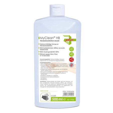 MaiMed MyClean® HB Händedesinfektion biozid - Eine hochwirksame, gebrauchsfertige Lösung für die hygienische und chirurgische Händedesinfektion. Diese Formel bietet umfassenden Schutz durch Reduzierung der bakteriellen transienten Hautflora und wirkt effektiv viruzid gemäß EN 14476, inklusive Schutz vor Polio-, Adeno-, Noro-Viren sowie weiteren Viren gemäß der zusätzlichen Viruzidieprüfung nach RKI/DVV (BVDV (HCV), Rota-, Vaccinia-, SV40-Viren).