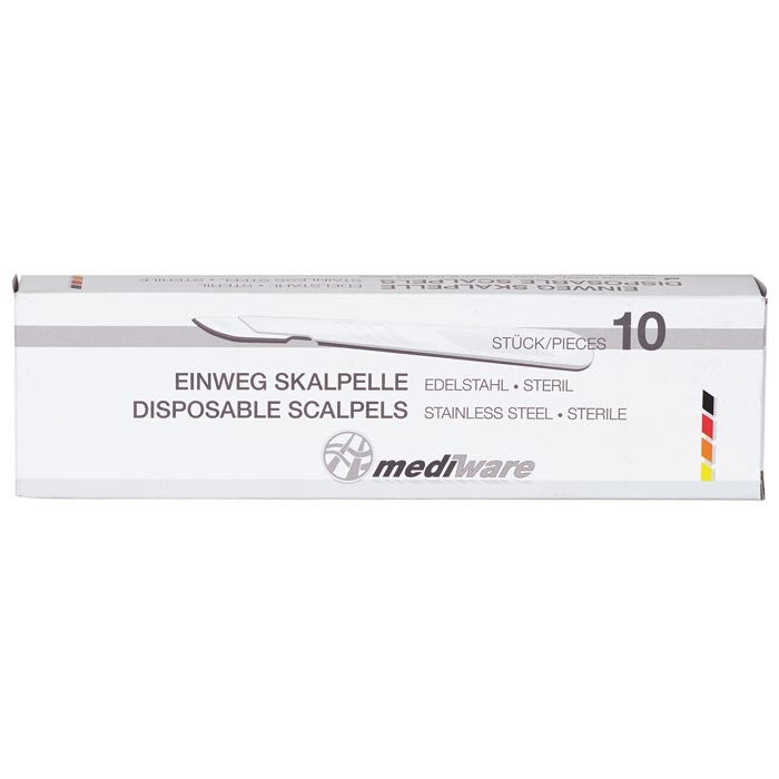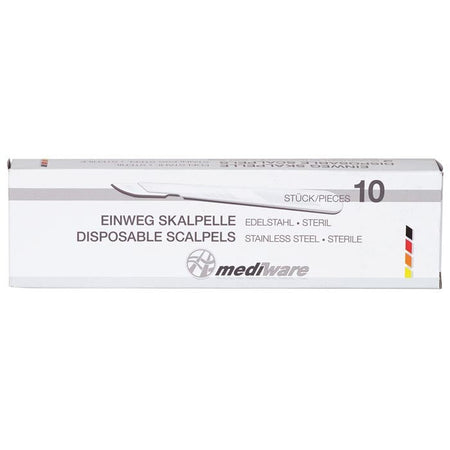 Mediware Einmalskalpelle mit Klingenform 10-25 - Packung à 10 Stk. - Diese Skalpelle zeichnen sich durch eine hochwertige Präzisionsklinge aus spezialgehärtetem Stahl aus und bieten höchste Schneidfähigkeit für medizinische Anwendungen. Der Kunststoffgriff garantiert durch seine sichere Verankerung der Klinge und den geriffelten Griffteil eine sichere Schnittführung.