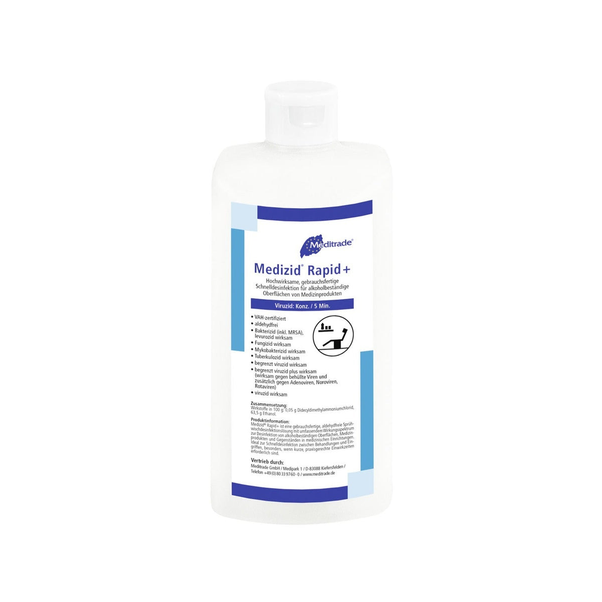 Medizid® Rapid+ Sprühwischdesinfektion 500 ml - Die Medizid® Rapid+ Sprühwischdesinfektion von Meditrade ist ein hochwirksames Desinfektionsmittel, das sich durch seine schnelle Wirksamkeit auszeichnet. Mit folgenden Eigenschaften überzeugt es: