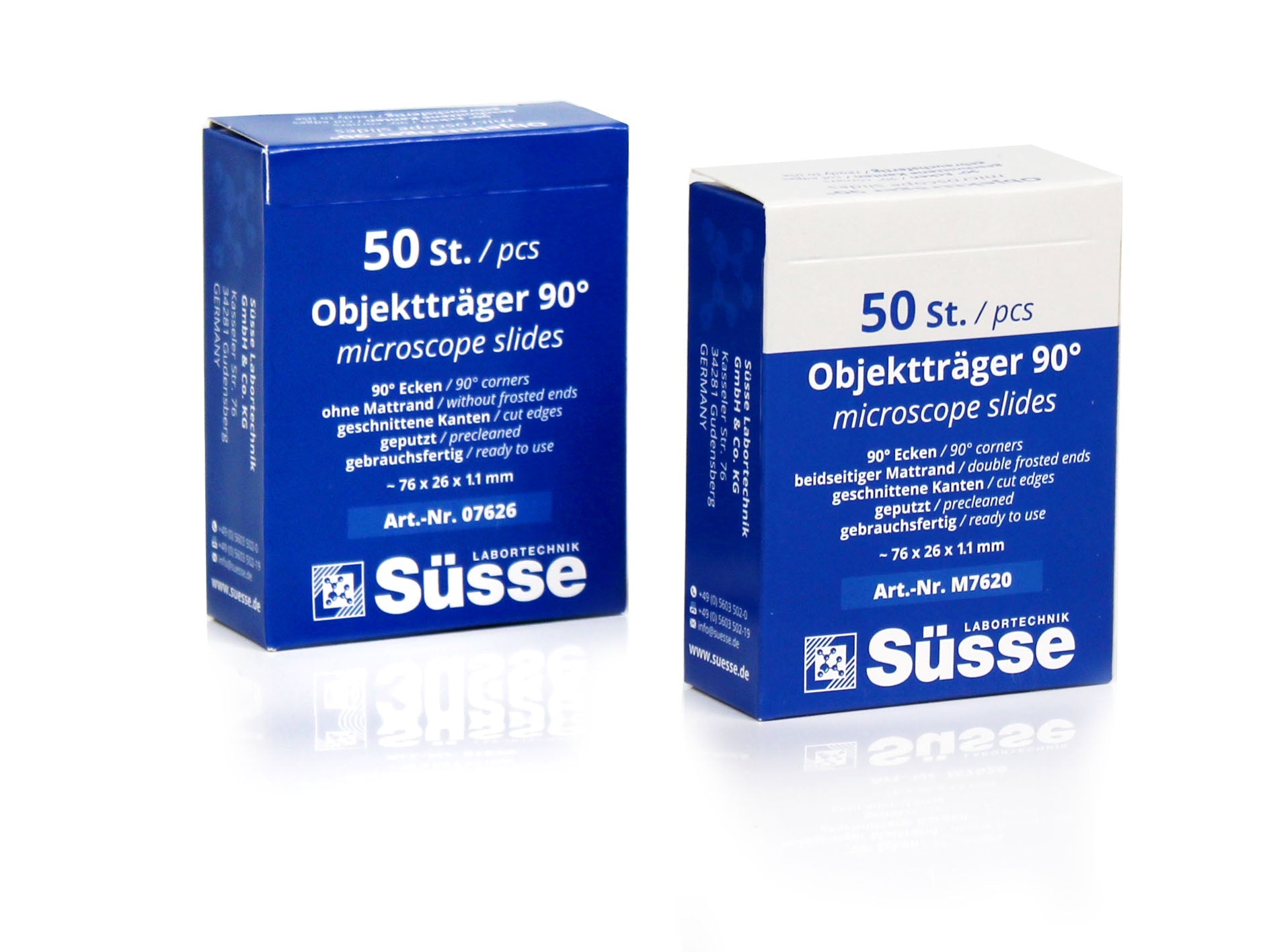 Eine Packung enthält 50 Objektträger mit den Maßen 76x26x1mm, alle mit geschliffenen Kanten, 90° Ecken und Mattrand.