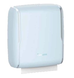 Tubeless Falthandtuchspender V-Falz in der Farbe EisBlau, ideal für die Ausgabe von Einzelblatt-Handtüchern. Dieser Spender vereint Funktionalität mit einem modernen Design, das in jedes Waschrauminterieur passt.